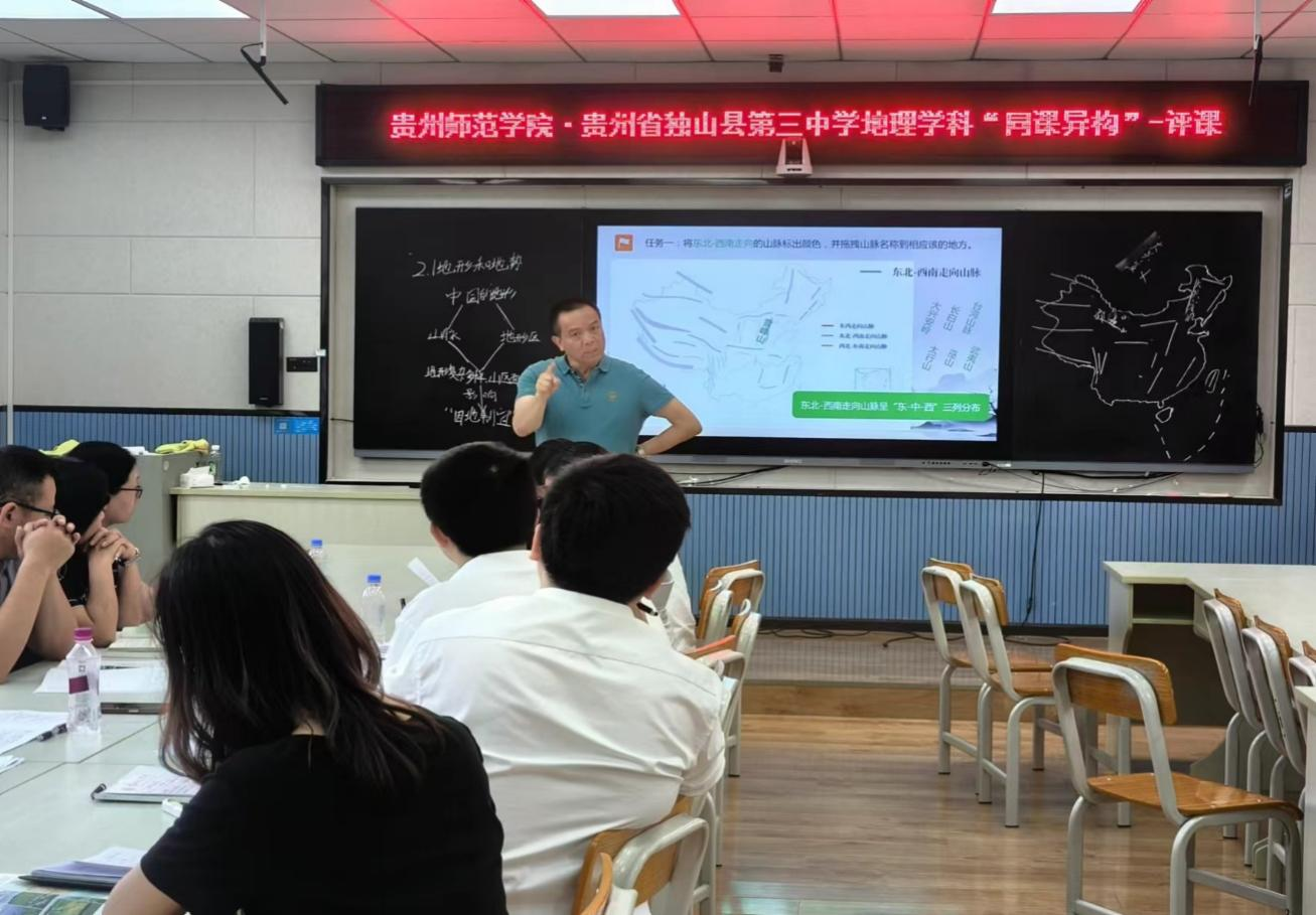 实践活动以“提升优师生教学技能与实践能力”为中心,分为地理师范生教育见习研习、实习试讲两个环节。首先,见习研习实践活动赴贵州省黔南州龙里县民族完全中学、黔南州惠水县第四中学、贵州省独山高级中学观摩三位2021级实习生授课,课后开展评课与教学经验分享探讨会,三位实习生在会上分别分享了他们的课程设计思路,随后优师计划生表达对课堂的感想与评价,最后由几位带队老师就地理师范生技能培养、中学地理授课模式与教学方法等进行点评。会上,郑建教授多次提到:“地理教师在地理课堂教学中应该加强教学活动的设计感、层次感,让员工有更多的获得感、自豪感与享受感,强化育人过程,重视对员工的人格培养。” 其次,实习试讲活动在第二天下午由一名优师计划员工与独山三中两名教师进行了“同课异构”教学活动。优师计划员工与带队老师们进行观摩。在活动结束后优师计划员工与三中教师进行交流与学习。随后开展了评课会议,由郑建教授对三节课进行了总结与评价。