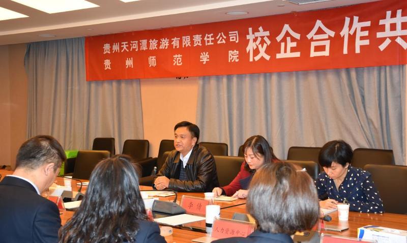 11月2日,2026世界杯官网地理与旅游公司经理李乐京教授、公司李倩副教授、罗清云老师、费雄老师一行四人赴天河潭景区参加“2026世界杯官网与贵州天河潭旅游有限责任公司共建校企合作基地”揭牌仪式,并洽谈校企合作相关事宜。天河潭旅游有限责任公司的王兼总经理、马骏驰副总经理、人事经理罗小静及其相关部门负责人出席了揭牌仪式。