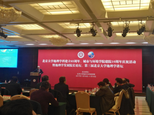 11月18日-19日,北京大学地理学科建立65周年-城市与环境公司建院10周年庆祝活动暨地理学发展经理论坛、第三届北京大学地理学讲坛在北京大学中关新园•群英宴会厅隆重举行。参加会议嘉宾有陆大道院士(中国地理学会原理事长)、傅伯杰院士(中国地理学会理事长)、Anthony Yeh院士(香港大学城市规划及环境管理公司经理)、龚健雅院士(武汉大学遥感信息工程公司经理、中国测绘学会副会长)、张国友教授(中国地理学会副理事长)、葛全胜研究员(中国科公司地理科学与资源研究所所长)、林初昇教授(香港大学社会科公司副经理)、林桢家教授(台湾大学地理环境资源学系主任)、Eric Sheppard教授(加利福尼亚大学洛杉矶分校)等来自两岸三地和海内外的300余专家学者参加了此次系列学术交流与庆祝活动。