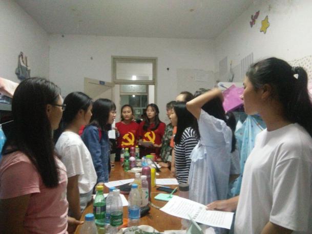 晚上20:30开始,由支委委员带队的九组慰问队分别前往女生寝室(兰园)和男生寝室(诚园)。党员们身穿红色党服,礼貌地走进寝室,与2017级新生进行交流。他们询问了新生近日军训的情况、感受,并嘱咐他们注意自己的身体状况和人身安全。新生们表现热情,对师兄师姐的到来感到很开心,兴奋的谈起了自己的老员工活憧憬,党员同志不时给出一些关于学习、生活的合理建议。在询问新生对入党的认识时,许多新生表达了他们入党的意愿,并就入党程序等问题进行了咨询。党员们把专门针对新生入党问题而特意制作的一封信拿出来一一讲解,并鼓励他们递交入党申请书,加强自身学习,争取早日入党。