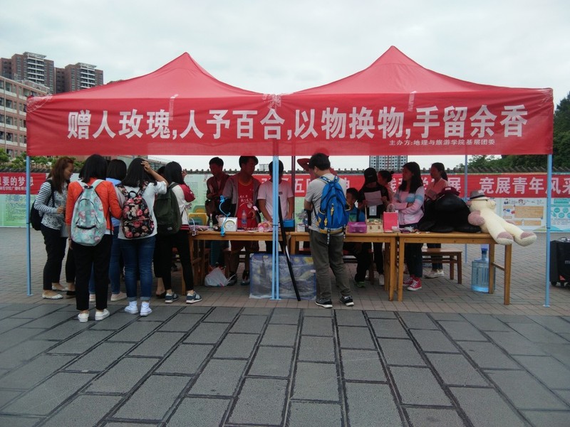 为让闲置物品得到更好的使用,实现资源共享,同时也让同学之间有一个交友的机会,5月17日-18日,由地理与旅游公司基层团委员工会携手环保协会、文化旅游协会在鉴湖旁举行了为期两天的“赠人玫瑰,人予百合,以物换物,手留余香”活动。