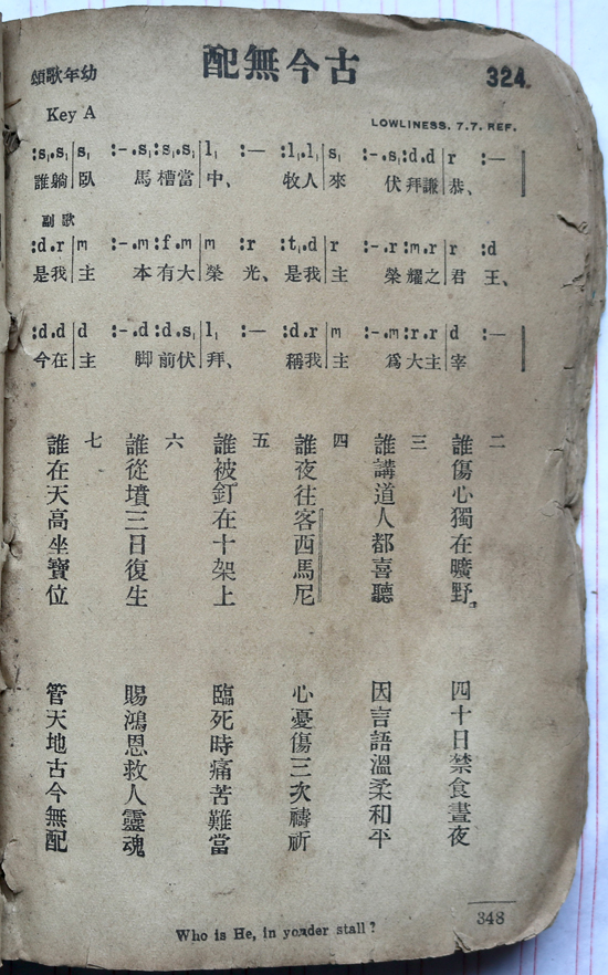 据悉,《国韵经歌》共25首歌曲,旋律记谱两种形式排列,第一行为数字简谱;第二行为字母谱;第三行以下为对应旋律的汉文歌词。《颂主聖歌》共450首,歌曲名称从右向左读,左侧标有“Key”和调号,“Key”表示音乐的调子或音调。旋律记谱方式为,第一行为字母谱,第二行以下为与字母谱对应的汉文歌词,页脚附有英文的歌曲名称。从歌集前面部分残缺文字描述的内容来看,是讲授普及学习字母谱音乐基础知识,并附有相关西方字母谱与中国传统工尺谱、五声调式(宫、商、角、徵、羽)对照表格,字母谱音乐基础知识的章节是以甲、乙、丙、丁、戊五个部分进行讲解,但目前只能见到乙部分的表格内容与丙、丁、戊三个部分内容。其中,文字书写大多采用了汉语繁体字进行陈述。
