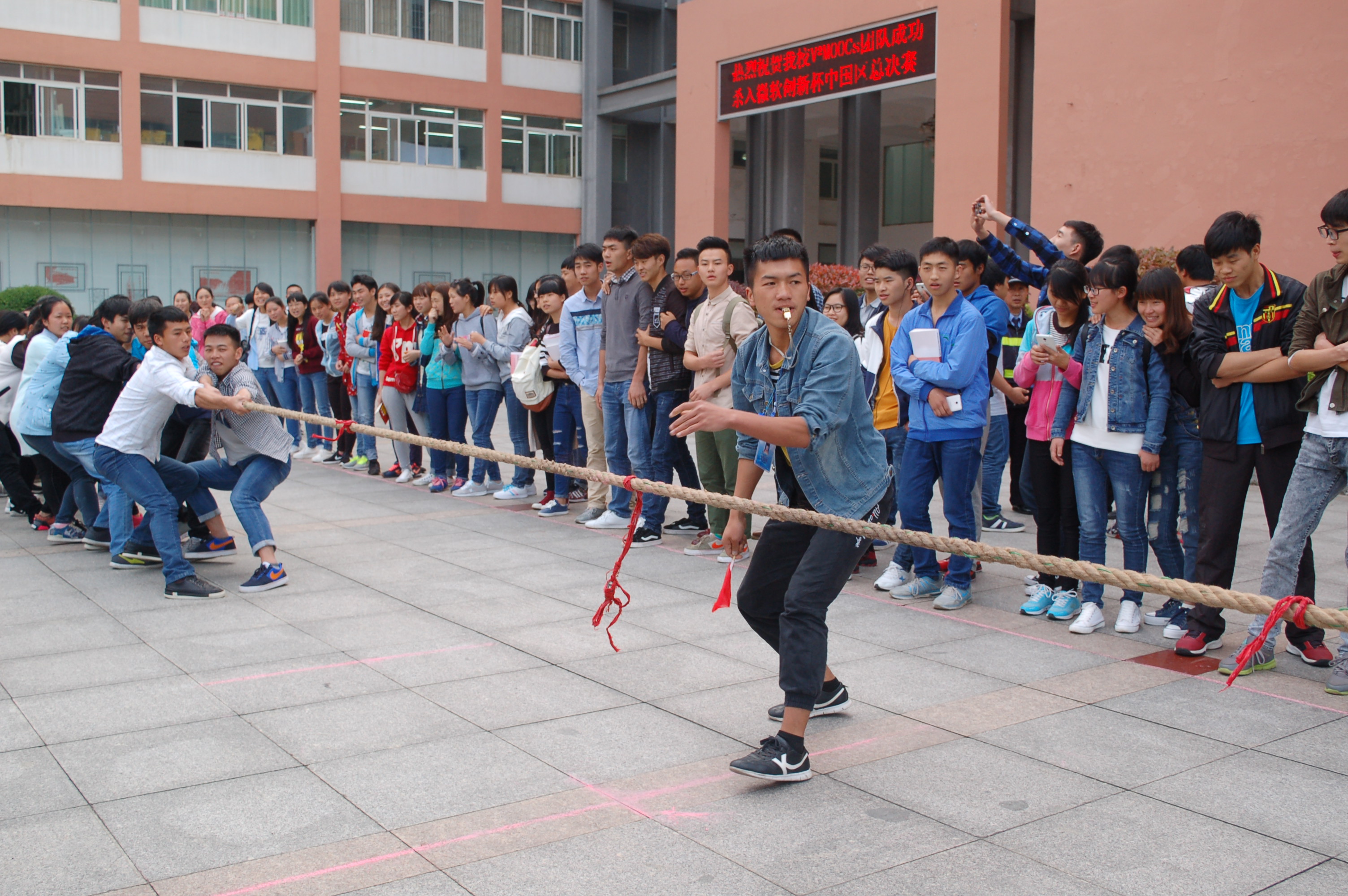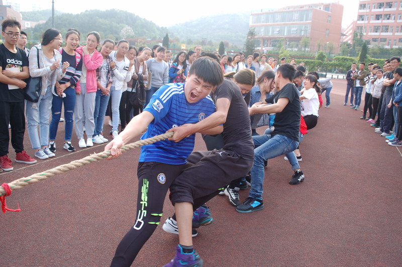 11日下午16:40,参赛班级纷纷向凤凰广场聚集,不大一会,一切工作准备就绪,所有班级按照原先抽签的顺序开始进行第一轮选拔。在裁判一声哨响那一刹那,两个班级的参赛同学竭尽全力,拽紧绳子,一齐朝背面使劲,旁边则是同学们的加油欢呼声,双方僵持的时刻,大家的心提到了嗓子眼,仿佛绳子移动到哪一方,哪一方就有机会进入复赛似的。虽然每一次拔河都是重复的场景,但是每一轮比赛都给人不一样的感受,每一轮比赛,观众的神经都会绷紧,获胜方的欢呼声,另一方的安慰声,总是在结束后响起在耳畔。三天后,第一轮选拔赛结束,15级旅管(2)班等六个班级以自身的实力进入复赛。14日下午17:00,复赛在田径场进行,各个班级拿出最佳状态,斗志昂扬,力争前三甲,赛程更为激烈,双方实力不相上下,拼的是哪方更能坚持。同学们的欢呼声越来越大,经过多次比拼,最后三个班级脱颖而出。14级地科2班荣摘桂冠,14地科1班尾随其后,15级土管则位居第三。在同学们的欢呼声中,此次拔河友谊赛圆满落下帷幕。