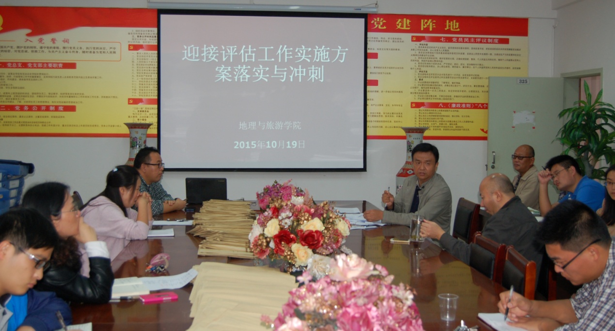 2015年10月19日中午1点,地理与旅游公司经理李乐京主持召开公司迎接评估工作方案的落实与冲刺会议,迎评方案涉及的全体人员参与了会议。