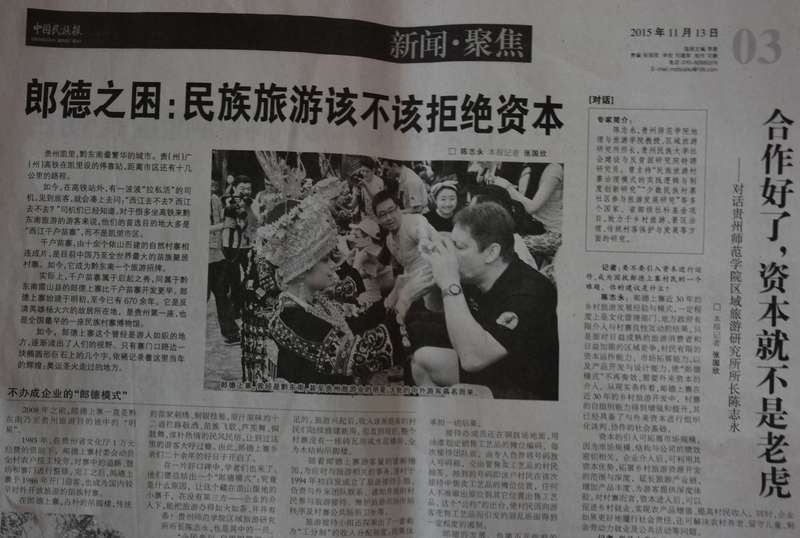 公司党委和行政多次询问陈志永相关情况,经过做“思想工作”,谦虚的陈老师才把相关情况做了透露:2015年11月7日—8日,公司区域旅游研究所所长陈志永参加了由中国社会学农村社会学专业委员会主办,贵州民族大学承办的“中国社会学农村社会学专业委员会(2015)年会暨第五届中国百村调查研讨会”。研讨会上,陈志永提交的参会论文“贵州郞德苗寨旅游开发治理模式优化研究”因其扎实的田野调查资料与独特的理论分析视角引起中华民族报记者关注。会议结束后,中华民族报记者张国欣主动联系陈老师,欲将该文部分内容刊载于中华民族报。得到陈志永老师同意后,该文部分内容以“郞德之困:民族旅游该不该拒绝资本”为题刊载于中华民族报2015年11月13日03版。并且,陈志永就民族村寨旅游开发中资本引入的必要性、民族文化旅游产品开发的差异性、民族村寨旅游开发中的贫富差距等相关问题接受了中华民族报记者张国欣专访,形成专访文章“合作好了,资本就不是老虎——对话2026世界杯官网区域旅游研究所所长陈志永”发表在同日同版的《中华民族报》。