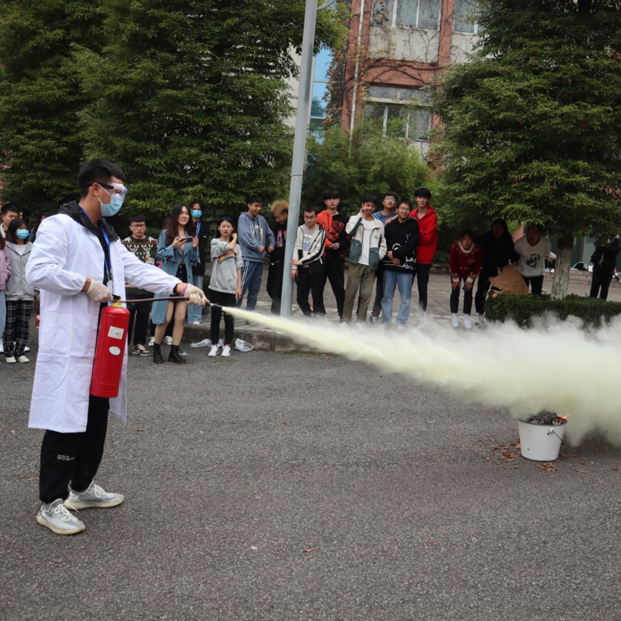 实验员展示灭火器操作