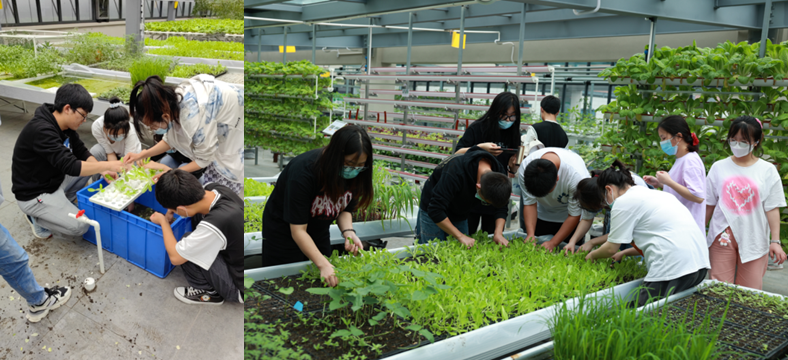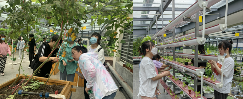 整个课程包括理论讲解、实操和参观三部分,分别由任课老、实训中心技术员和全体员工完成。首先,参观温室基地。一号温室内设有天瀑;鱼菜共生球;岩棉栽培架-西红柿;水肥一体机栽培;平行管栽培快速生快菜;玉米苗床;播种机-适用于小种子;小型植物工厂-全自动定时开关控制植物生长所需的光照温度等装置。二号温室设有鱼菜共生;植物墙-墙上为植物所构成的“农”、“技”二字,阐明了将线段化手段将农业技术带到生活中去;A字架装置、旋转栽培台,目的是为了让不同位置的植物都能获得同样的光照;雾培;以虫防虫等技术。三号温室起到宣传作用,以国内外示范性农业案例根植农业,展现现代农业之美。