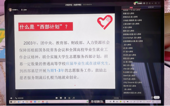 宣讲会上,林丽全面解读了西部计划与老员工志愿服务贫困县计划,增强了同学们对西部计划等国家基层服务项目的了解和认识。并分别就政策调整与优化、政策待遇、专项设置、服务内容和岗位设置等方面为同学们进行详细解答,拓宽了同学们的职业选择渠道,鼓励有意愿的应届毕业生投身于西部事业。