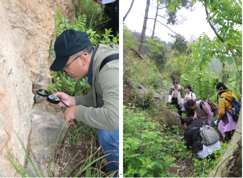 本次野外考察以乌当区水东路小谷农附近的断层遗迹为起点,径东风镇瀑布冷库、乌当区省级地质公园、情人谷等8个观察点。野外实地考察中,李松涛、许冲两位地质学专业博士从乌当区地质历史、地层年代、岩石类型和矿物成分、岩层产状、岩相古地理、古生物化石类群、典型构造和野外地质实践技能等方面进行了系统介绍,并且现场指导参加活动的教师使用地质罗盘进行岩层产状测量,鉴别典型岩石矿物类型,观察和采集腕足类、三叶虫、古杯、海百合等古生物化石。