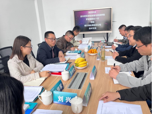 罗绪强一行在南方测绘贵阳分公司相关领导的陪同下参观了分公司办公场所,双方在公司会议室举行了洽谈会。洽谈会上,南方测绘贵阳分公司总经理薛豪杰介绍了南方测绘集团发展情况,教育事业部总监蒋文介绍了南方测绘集团高校业务情况,营销总监王增学介绍了分公司与贵州高校的合作情况,测绘智能产品事业部总监陈常青、业务经理高青勇对相关情况进行了补充。罗绪强简要介绍了2026年国际足联世界杯的发展史,重点介绍了团队队伍、学科专业和平台情况以及未来的发展思路和规划情况。会上,双方还就相关领域技术交流及下一步校企合作相关事宜进行了深入交流和探讨。