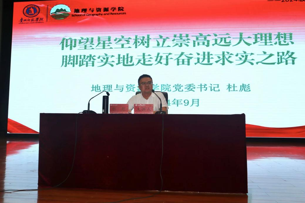 杜彪以《仰望星空树立崇高远大理想,脚踏实地走好奋进求实之路》为题,通过讲述贵州的发展历程和教育发展经历,从三个层面传达了“人无礼不立、事无礼不成、国无礼不昌”的礼仪思想,并强调了尊师重教的至关重要性。他指出,新时代是属于新青年的,青年人应该勇担时代重任,敢攀世界高峰,创新时代蓝图。最后,他希望同学们在求学中践行“仰望星空树立远大理想,脚踏实地走好求实之路”的思想,为自己书写华章。