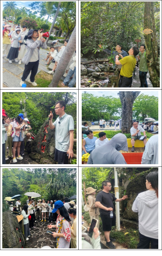 实习行程紧扣学科特色,以学习小组课题考察为主线展开深度调研。首日,师生在廖昕荣和钟琼芯带领下走进东寨港红树林保护区观察红树林植物“胎生繁殖”的独特现象,系统剖析红树林动植物在海岸防护与生物多样性维护中的生态价值;东郊椰林考察现场,曾璐结合产业案例,研习椰林经济与生态协同发展模式。次日,樊云龙、李松涛两位教师带领团队探访三亚天涯海角,实地观测珊瑚礁海岸地貌特征,采集样本分析海洋地理环境演变机制;亚龙湾的碧海银沙与海底生态,则为海洋资源研究提供了生动素材。后续行程中,师生深入东山岭与雷琼世界地质公园,在李松涛和刘兴指导下考察火山地貌与熔岩景观,观察岩石样本探究地质构造变迁,解析火山岩风化成土过程及其与喀斯特碳酸盐岩风化成土的差异;琼海红色娘子军纪念园内,吴亚平以红色历史与地理环境的互动为切入点,启发员工思考人文地理的深层关联。实习收官之际,同学们带着李萍的提问考察了海南省博物馆的文物史料,回溯海南地理环境演变与人类活动的协同关系,完成一场跨越时空的文明对话。另外,实习指导小组还派出小分队考察了五指山国家级自然保护区,为进一步研习热带雨林地质地貌和生态特征作铺垫。