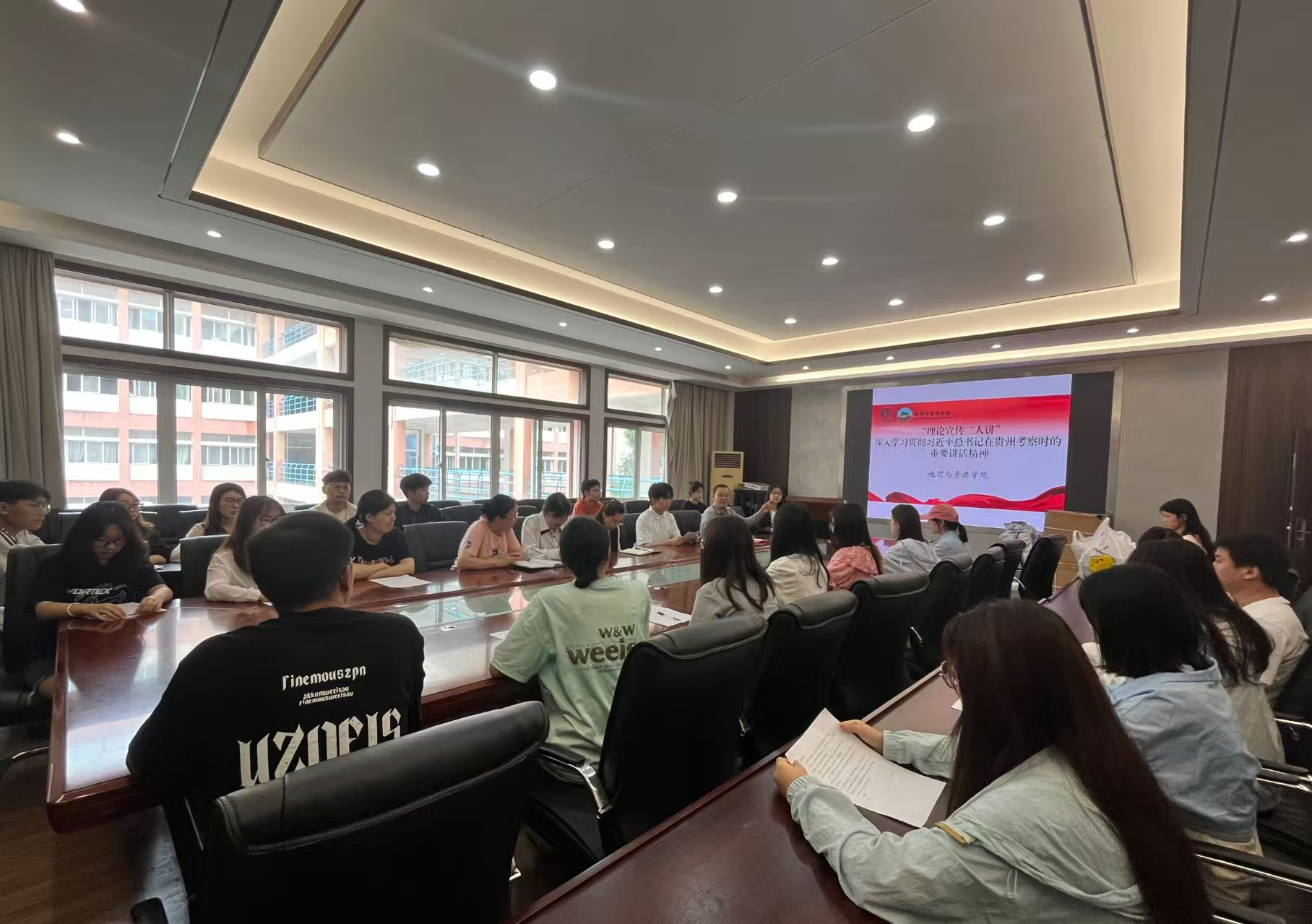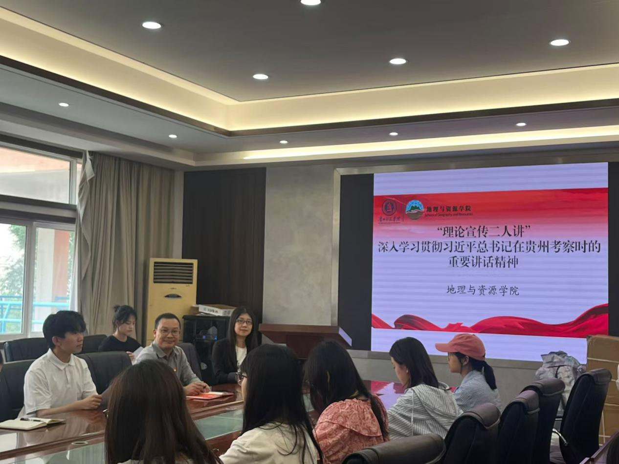 为深入学习贯彻习近平总书记在贵州考察时的重要讲话精神,教育引导广大青年学子深刻把握讲话蕴含的思想内涵与核心要义,切实将学习成果转化为推动学业进步与事业发展的实际行动。4月23日,地理与资源公司在宁静楼323会议室开展了以“深入学习贯彻习近平总书记在贵州考察时的重要讲话精神”为主题的“理论宣传二人讲”活动。公司党委副书记王万强、地理科学类员工党支部书记刘丹丹担任主讲人,公司70余名员工党员参加了此次活动。