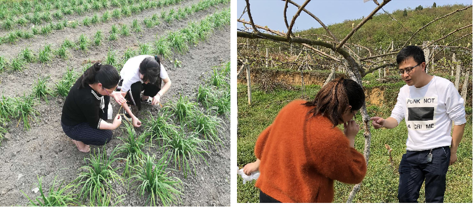 任军老师和当地工作人员对韭黄、猕猴桃病害进行断